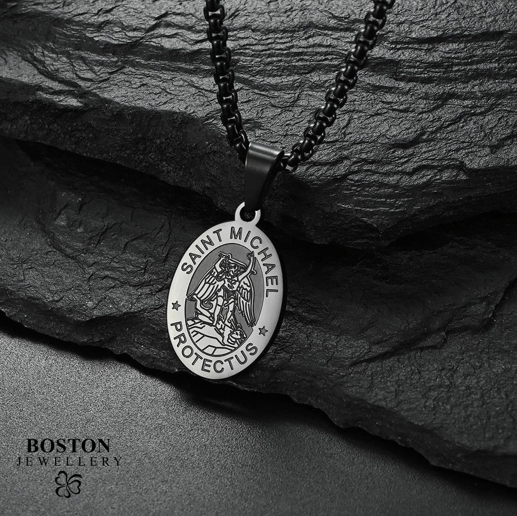 CZARNY MEDALIK ZE ŚWIĘTYM MICHAŁEM ARCHANIOŁEM + ŁAŃCUSZEK SPLOT KRÓLEWSKI 60 CM BOSTON JEWELLERY