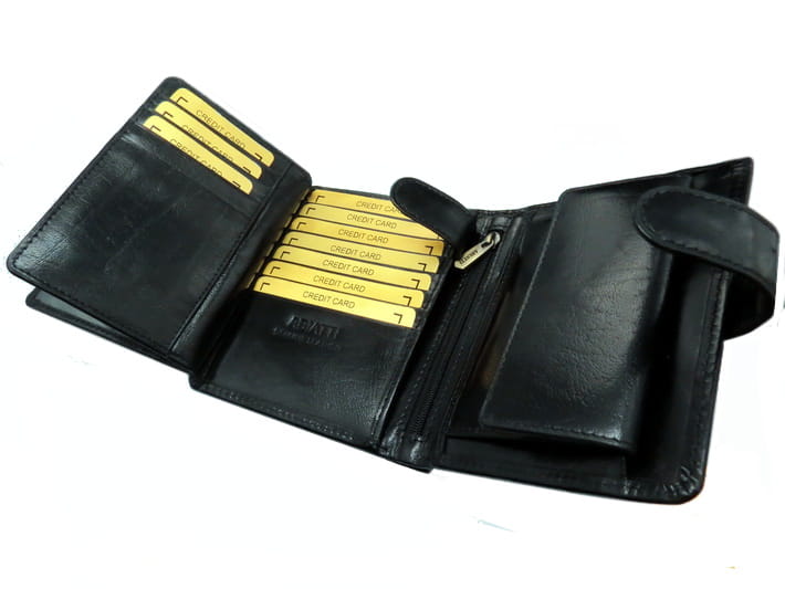 Portfel z pełną ochroną RFID. TWOJE PIENIĄDZE I DANE SĄ BEZPIECZNE !!! W tym modelu zastosowana została specjalna membrana RFID (Radio-Frequency Identification), która chroni karty zbliżeniowe przed kradzieżą pieniędzy oraz inne dokumenty przed nieautoryzowanym odczytem danych. Wszyta pomiędzy skórą naturalną, a podszewką membrana RFID uniemożliwia odczyt danych za pomocą specjalnych czytników wykorzystywanych przez złodziei. Membrana blokuje sygnał i czytnik nie wykrywa kart umieszczonych w portfelu.