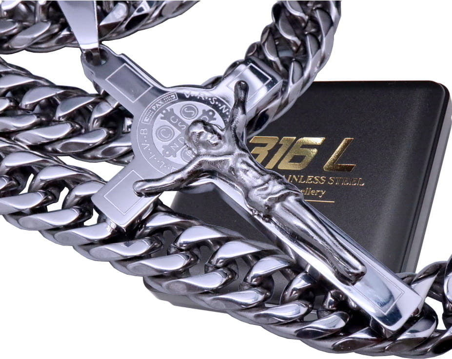 Dedykowany łańcuszek do tego krzyżyka posiada bardzo ciekawy splot i solidne zapięcie oraz przepiękny kolor AUTENTYCZNEJ STALI CHIRURGICZNEJ 316L.