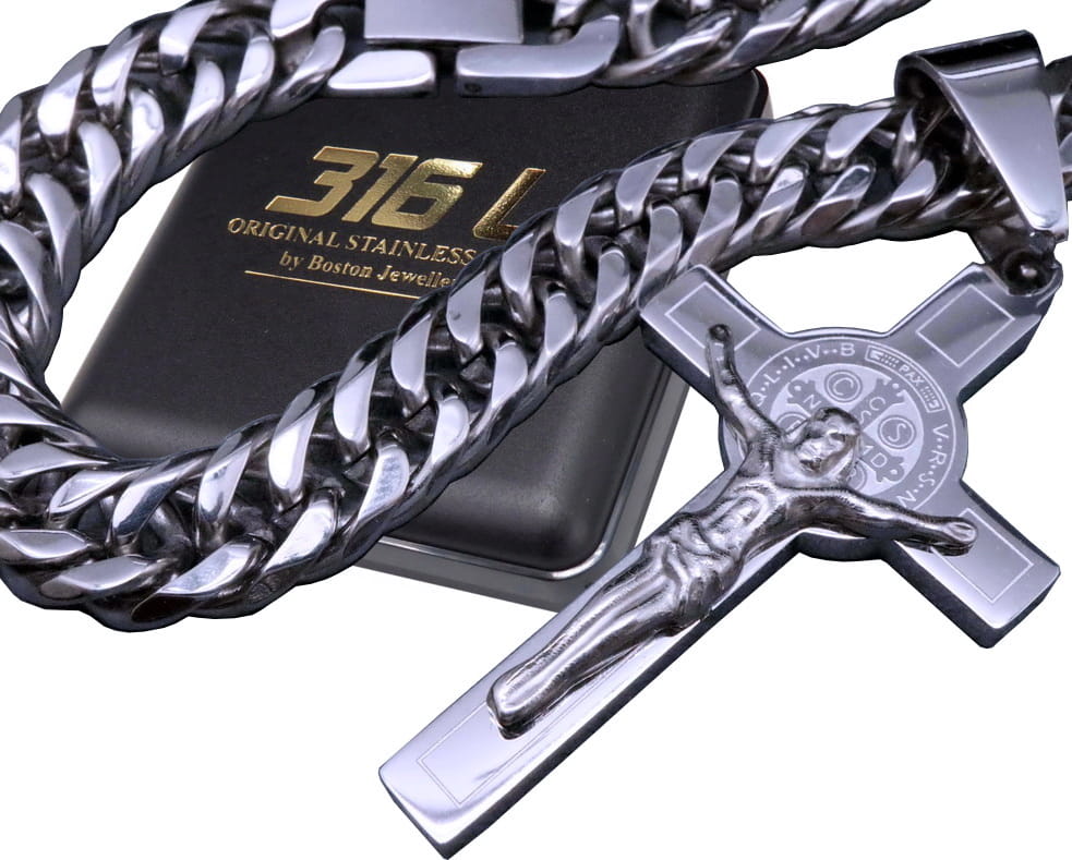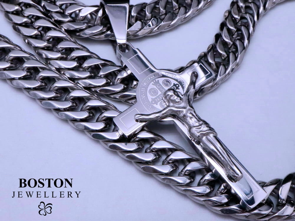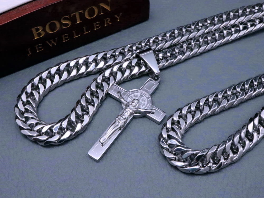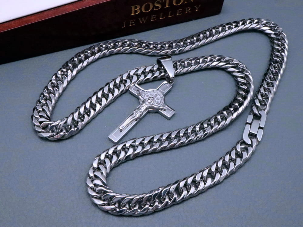 GRUBY SREBRNY ŁAŃCUSZEK Z KRZYŻYKIEM STAL CHIRURGICZNA 316L ZESTAW PREMIUM BOSTON JEWELLERY