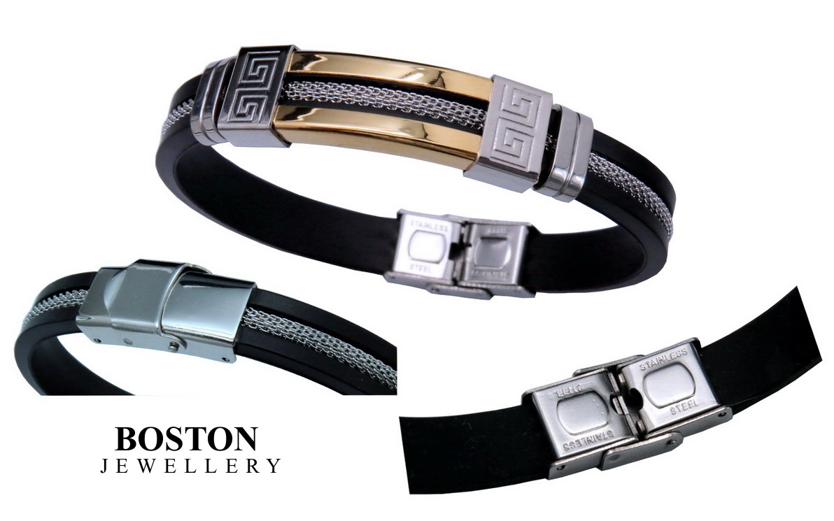 W tej ofercie prezentujemy bransoletę męską, która wykonana jest z NAJWYŻSZEJ JAKOŚCI STALI CHIRURGICZNEJ 316L platerowanej 18k ZŁOTEM oraz bardzo wytrzymałego kauczuku jubilerskiego. Niektóre modele posiadają również elementy anodyzowane na czarno.