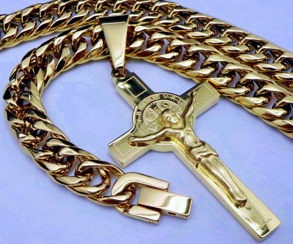 W tej ofercie prezentujemy wyjątkowo elegancki zestaw łańcuszka z krzyżykiem, który wykonany jest z NAJWYŻSZEJ JAKOŚCI STALI CHIRURGICZNEJ 316L platerowanej 18k złotem. Jest to zestaw z najnowszego katalogu, którego odznacza bardzo ciekawy i unikatowym design oraz ELEGANCKIE ZAPIĘCIE KLASY PREMIUM.