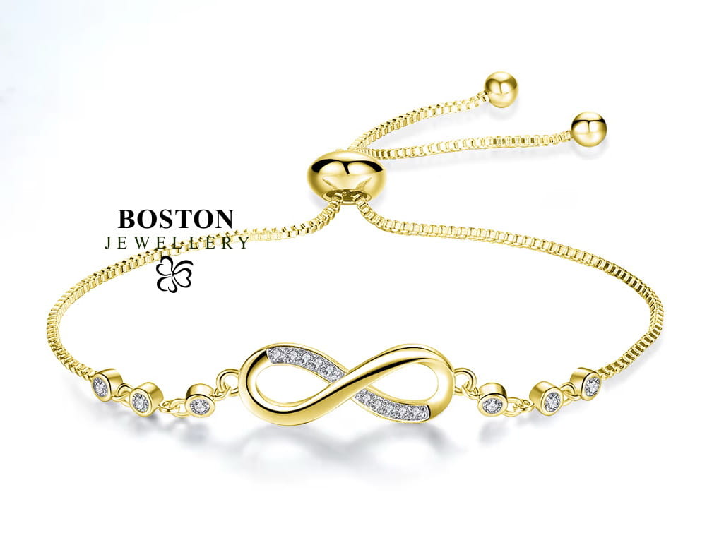 W tej ofercie prezentujemy wyjątkowo elegancki model damskiej bransoletki z motywem nieskończoności, który wykonany jest z NAJWYŻSZEJ JAKOŚCI STALI CHIRURGICZNEJ 316L platerowanej 18k złotem. Model ten wyróżniają bardzo eleganckie ogniwa połączone z przepięknymi CYRKONIAM Z GĘSTYM SZLIFEM BRYLANTOWYM. Taki układ bardzo efektownie prezentuje się na dłoni i robi niesamowite wrażenie !!! Jest to jeden z najciekawszych i najlepiej sprzedających się modeli w ostatnim czasie !