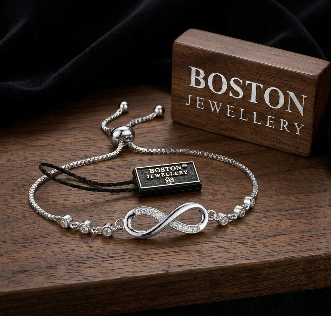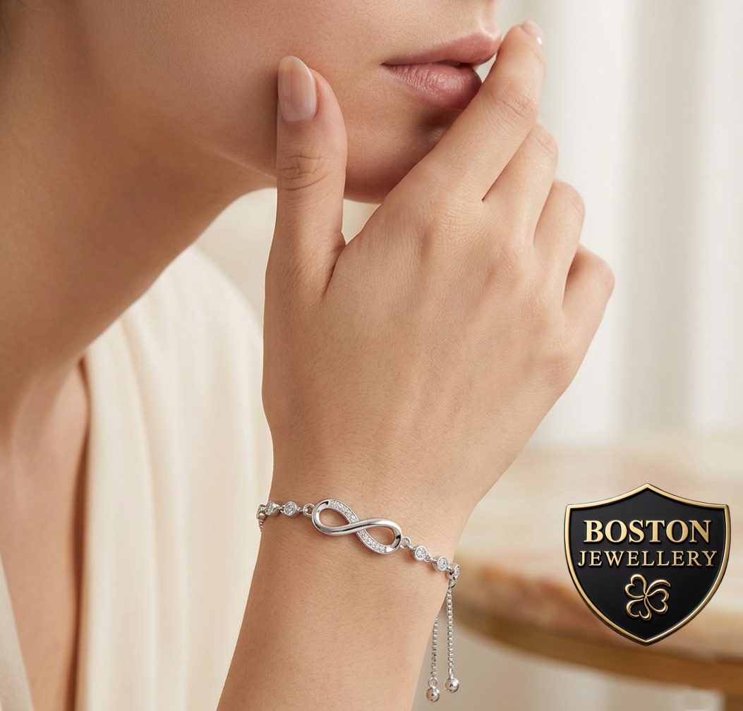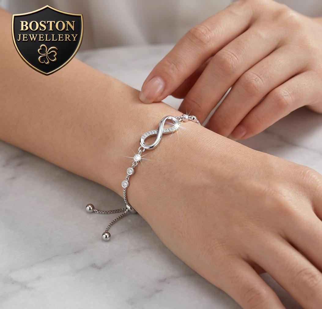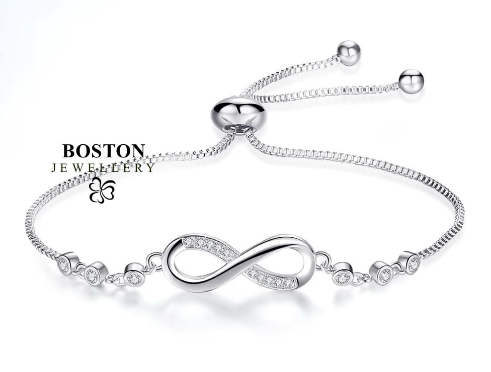 ORYGINALNA SREBRNA BRANSOLETKA DAMSKA Z CYRKONIAMI REGULOWANA NIESKOŃCZONOŚĆ NA PREZENT BOSTON JEWELLERY