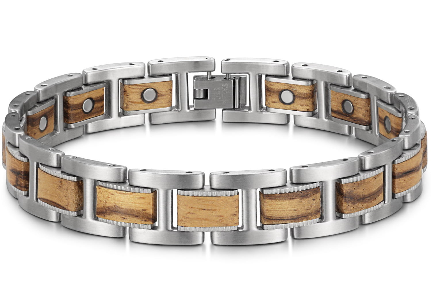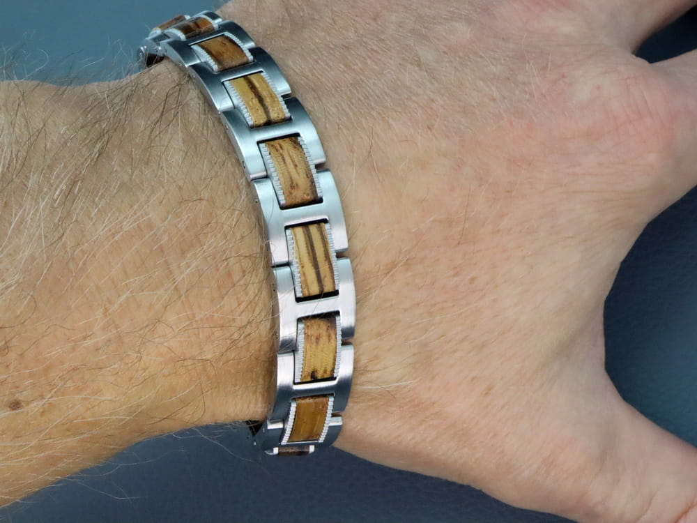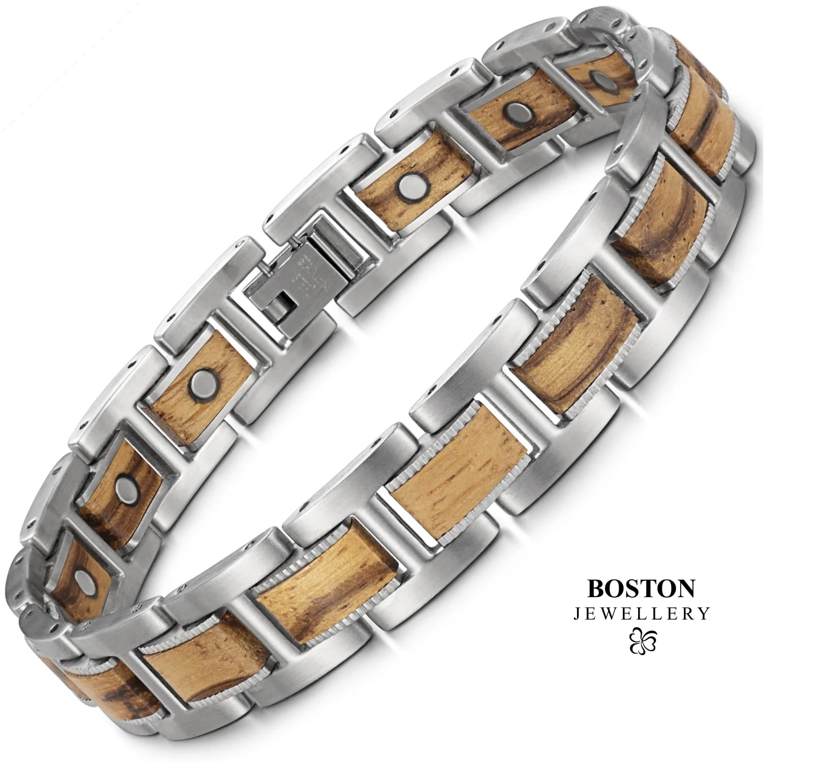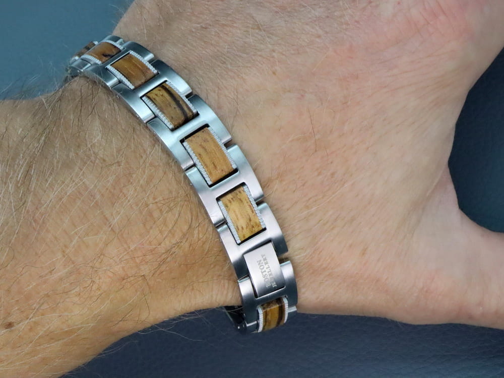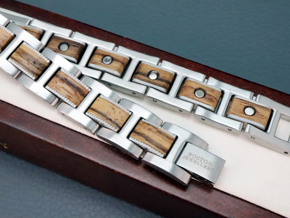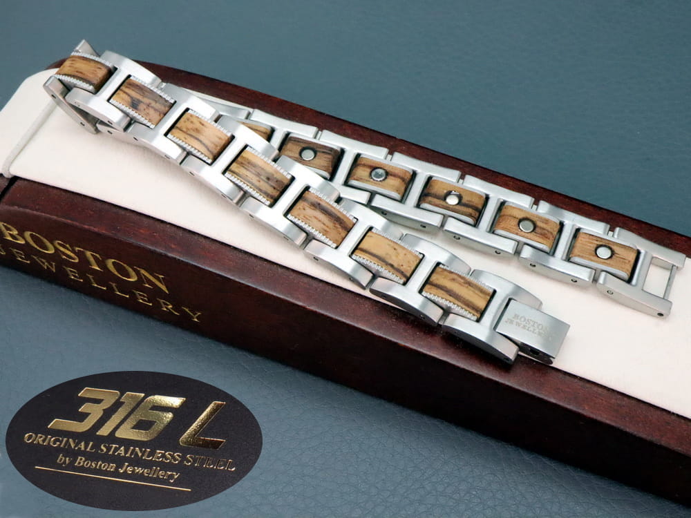 ORYGINALNE WYROBY JUBILERSKIE MARKI BOSTON JEWELLERY TO PRESTIŻ I PRAWDZIWA KLASA !!!Oferujemy państwu kolekcje biżuterii ze stali chirurgicznej 316L od czołowego producenta zaopatrującego rynek amerykański. Biżuteria ta jest produkowana w zaawansowanych technologicznie zakładach w oparciu o najnowsze technologie, dlatego też produkty te charakteryzuje niesłychana wręcz precyzja wykonania - każdy pojedynczy element to prawdziwe arcydzieło !!! Spasowanie elementów oraz wykończenie są bardzo solidne, a całość wygląda imponująco! Bransoleta jest idealnie wypolerowana przez co świetnie się prezentuje. Posiada bardzo solidne zapięcie i możliwość skrócenia o dowolną ilość elementów. UWAGA !!! TYLKO ORYGINALNE WYROBY BOSTON JEWELLERY POSIADAJĄ WSTAWKI Z NATURLANEGO DREWNA O PRZEPIĘKNEJ BARWIE.